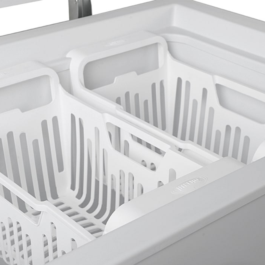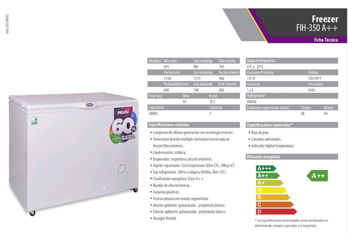 Freezer Full-4 Funciones de Frío. Nuevo tablero, Un Canasto, Ruedas Giratorias de alta resistencia, Interior en chapa pre pintada blanca, Desagote Frontal. Refrigerante R600a. Eficiencia Energética A++.